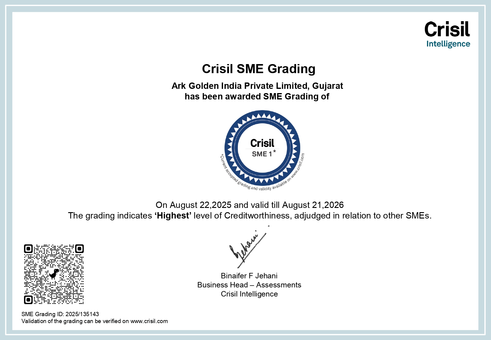 Ark Golden India Pvt. Ltd. is amongst top SMEs in India who have been rated with highest CRISIL rating continuously for past 15 years without any negative deviation in performance and financial strength.